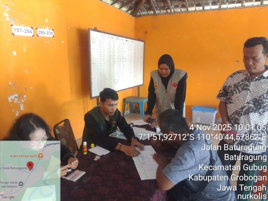 Gubug, 04 November 2025,, Bidang Rehabilitasi dan Rekonstruksi (RR) BPBD Kabupaten Grobogan melaksanakan kegiatan penandatanganan penerimaan Bantuan Sosial Tidak Terencana untuk penanganan sawah pertanian terdampak banjir di Desa Baturagung, Kecamatan Gubug.