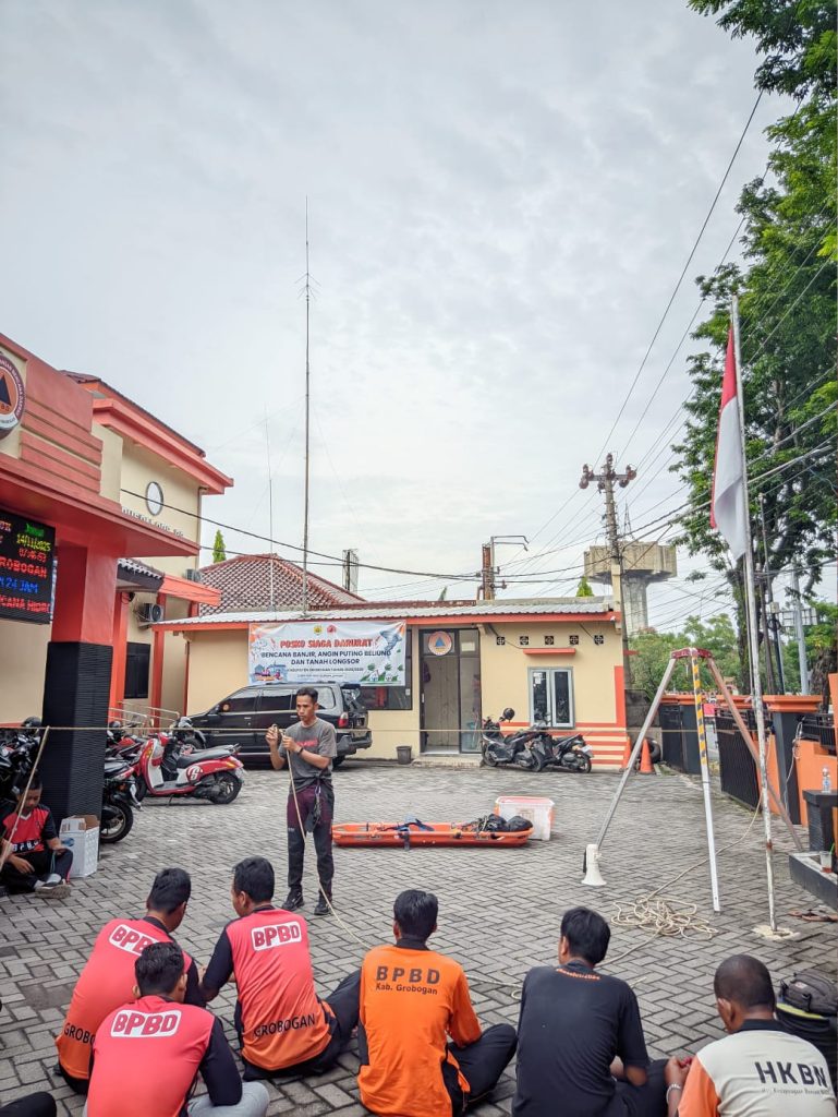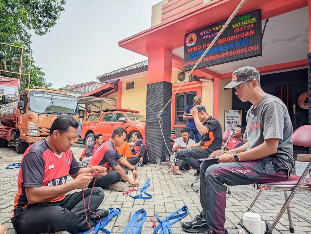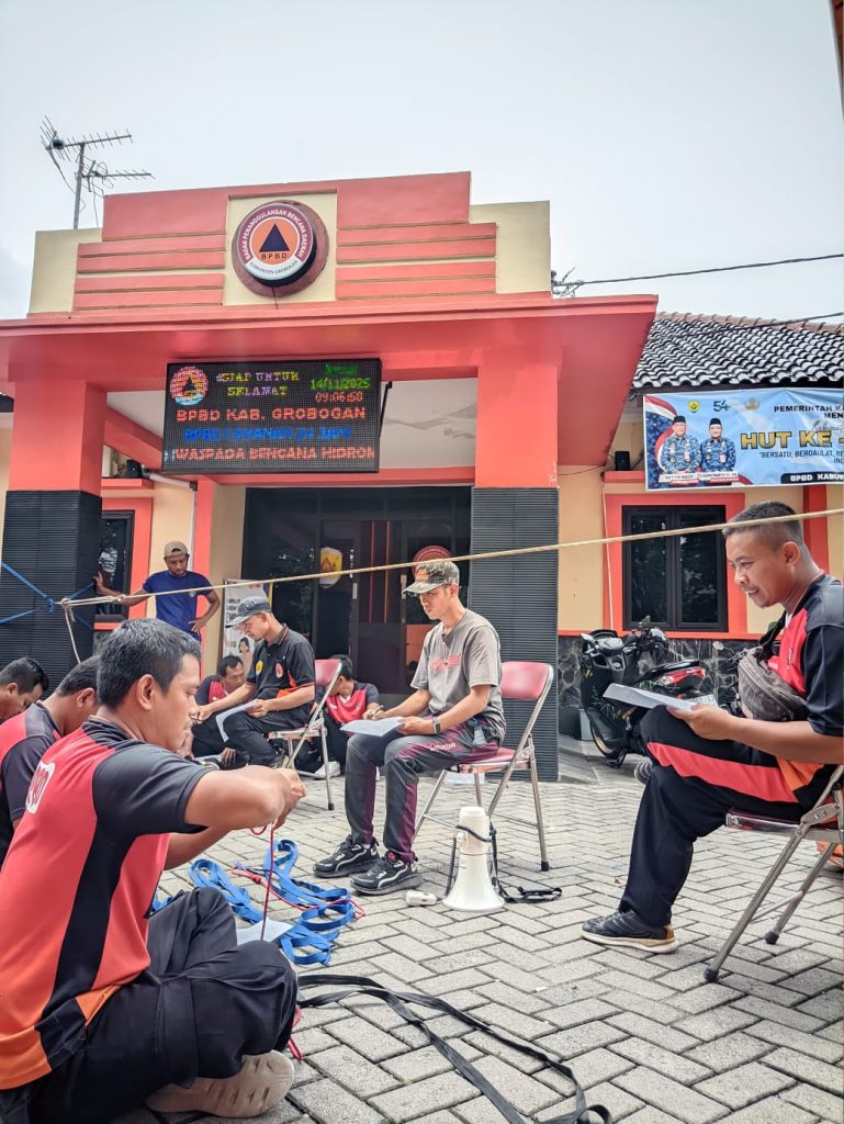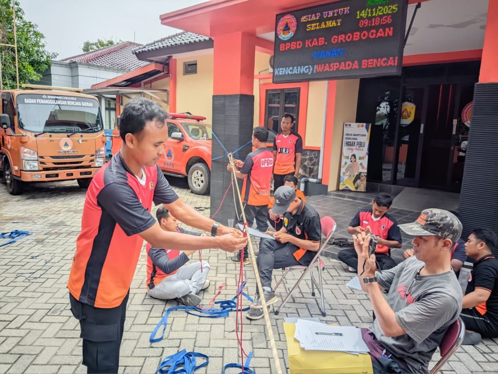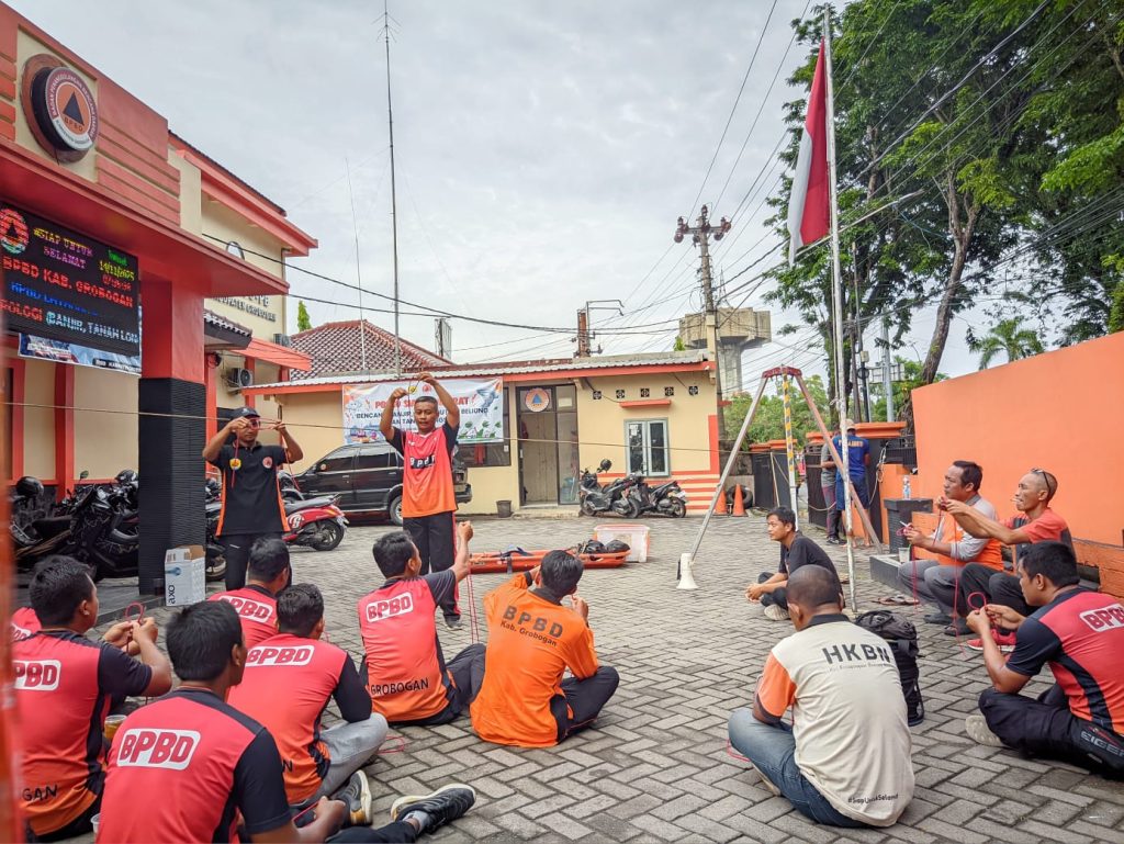 Jumat, 14 November 2025 – Tim Reaksi Cepat (TRC) BPBD Kabupaten Grobogan melaksanakan kegiatan pembinaan jasmani (binjas) yang dilanjutkan dengan peningkatan kapasitas melalui pelatihan teknik simpul dan penggunaan berbagai jenis simpul yang diperlukan dalam penanganan kedaruratan.