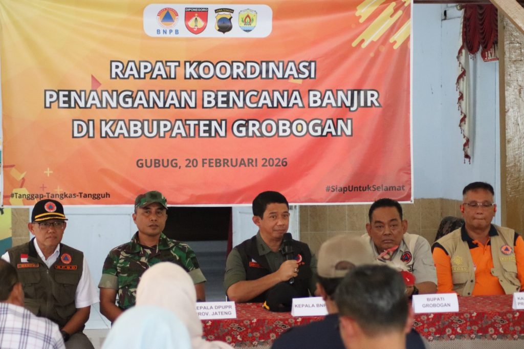 Grobogan, Jumat 20 Februari 2026 – Kepala Badan Nasional Penanggulangan Bencana (BNPB) melakukan peninjauan langsung ke lokasi tanggul sungai tuntang yang jebol di Desa Tinanding, Kecamatan Godong, Kabupaten Grobogan, pada Jumat (20/2). Kunjungan ini dilakukan sebagai bentuk perhatian dan dukungan pemerintah pusat terhadap upaya penanganan darurat bencana banjir yang melanda wilayah tersebut.