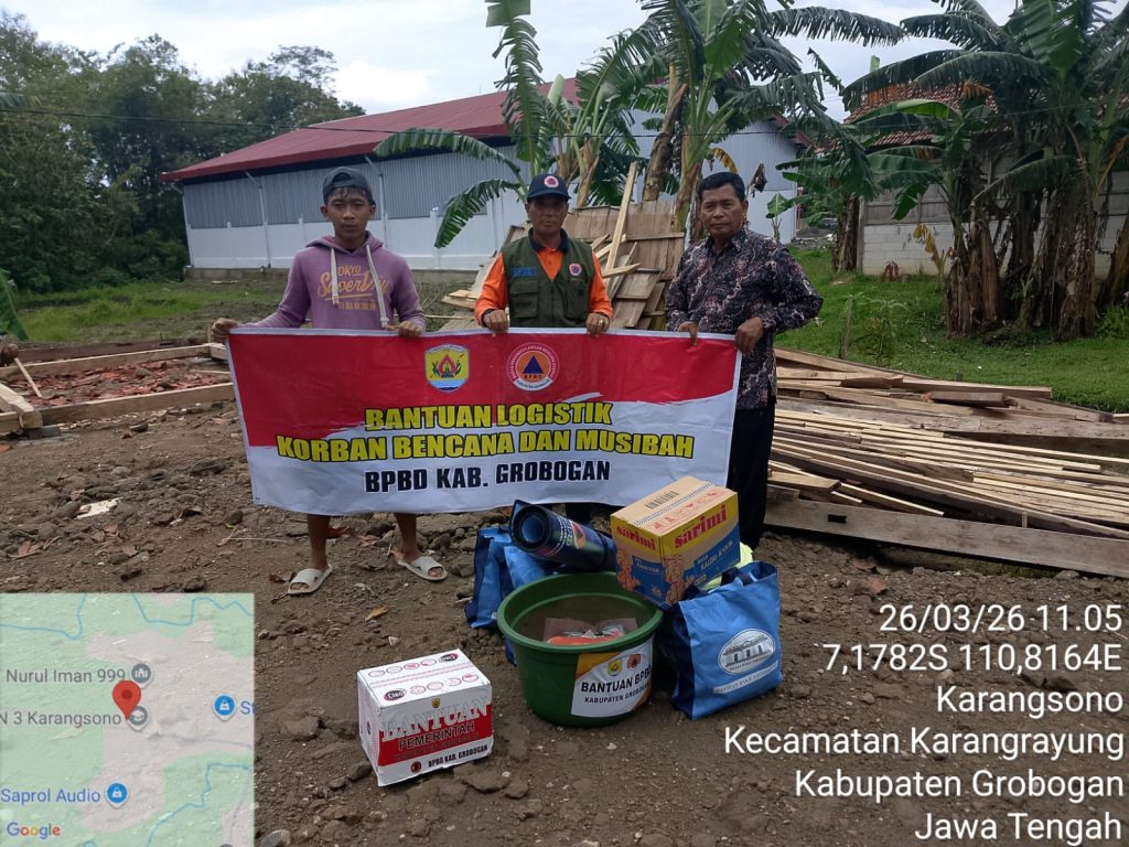 Kamis, 26 Maret 2026 — BPBD Grobogan melaksanakan kegiatan pendistribusian bantuan logistik kepada warga terdampak bencana angin kencang di sejumlah wilayah di Kabupaten Grobogan.