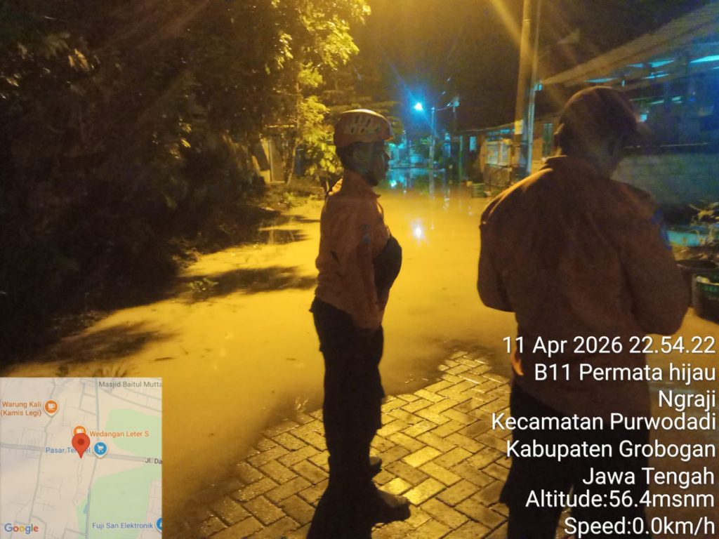 Grobogan — Hujan dengan intensitas tinggi yang mengguyur wilayah Kabupaten Grobogan pada Sabtu (11/4/2026) sore, menyebabkan banjir di sejumlah titik di Kelurahan Kalongan, Kecamatan Purwodadi.