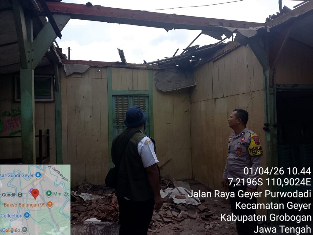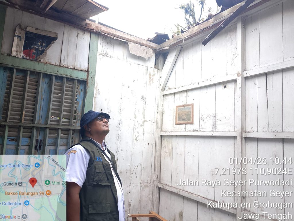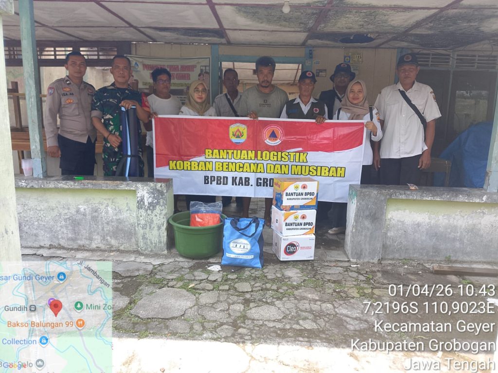 Grobogan — Rabu, 1 April 2026, Badan Penanggulangan Bencana Daerah (BPBD) Kabupaten Grobogan melaksanakan kegiatan asesmen serta pendistribusian bantuan logistik bagi korban bencana angin kencang di Desa Geyer, Kecamatan Geyer.